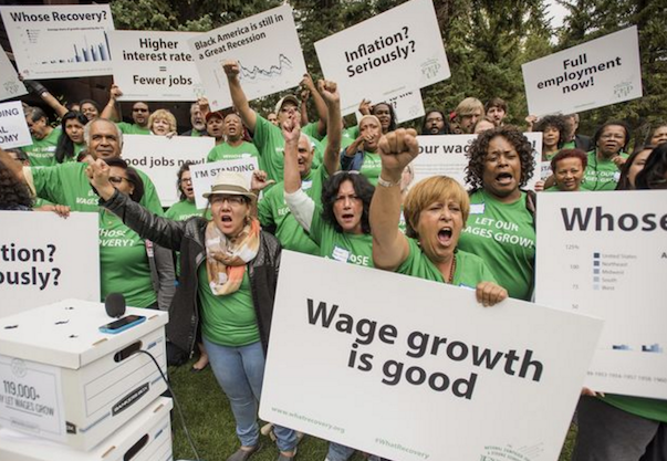 ↑ジャクソンホールでの抗議活動。インフレが庶民生活を圧迫するとの声。