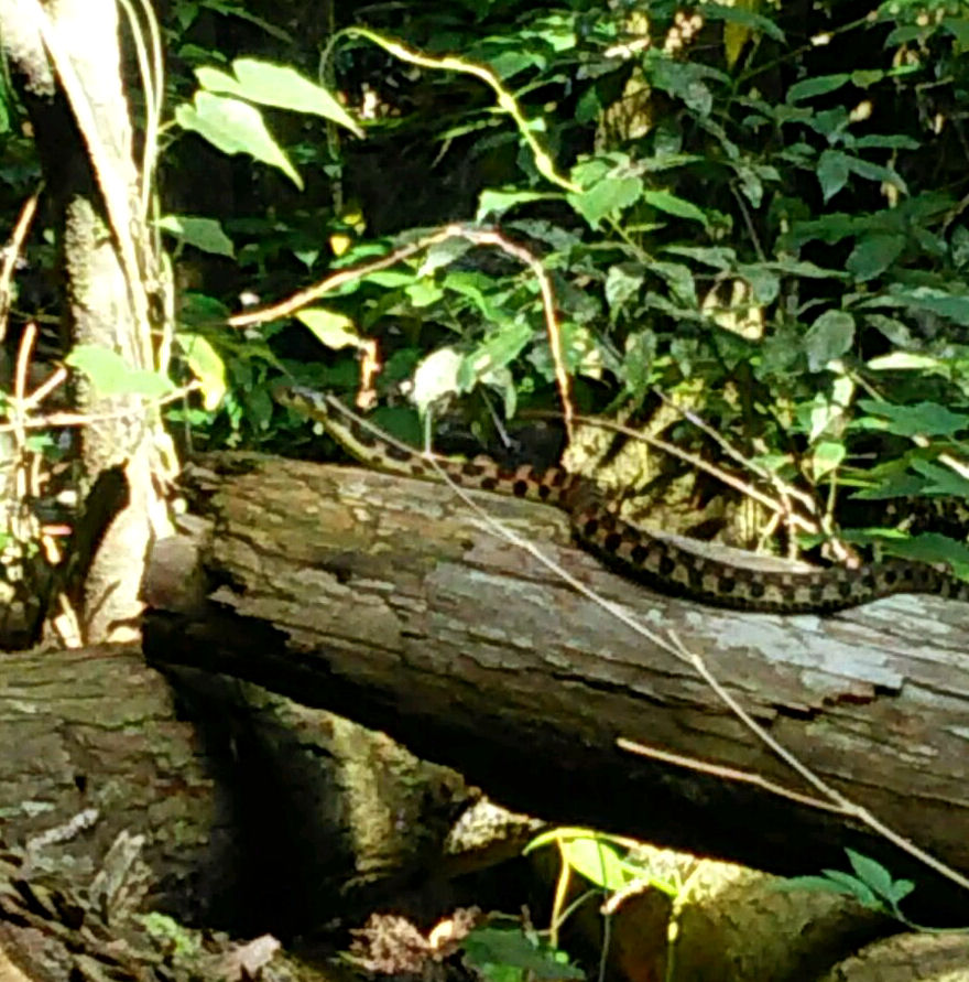 写真のヤマカガシは、滝壺に向かう林道に居たので