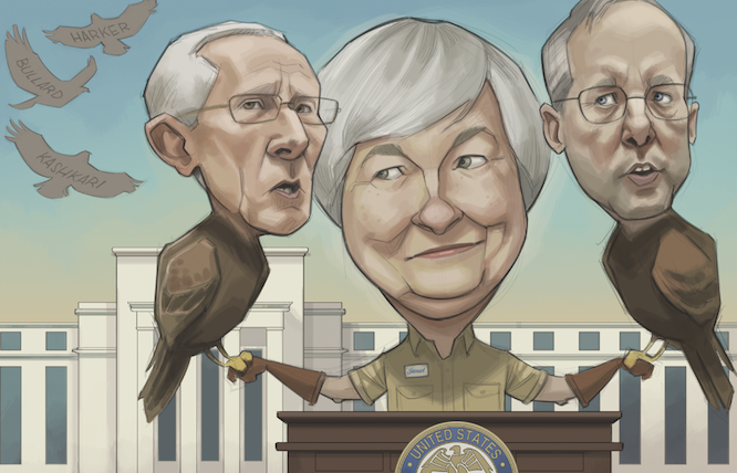 ↑イエレンFRB議長はタカ派のフィッシャーとダドリーを従えて…。