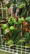 わが家に小さいけど木瓜(ボケ)があって、2月くらいから赤や白の花が咲きます。数年前から実がなるようになり、毎年1~2個の実をつけるのですが、ことしは写真のように豊作なようです。