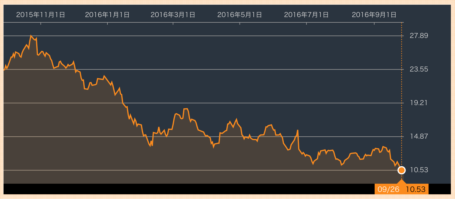 ↑ドイツ銀行の株価チャート。ガンガン値を下げ続ける地獄絵図!
