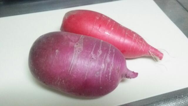 写真は拡大する前は紫アケビかと思っちゃいました。ハハハハ。。両方とも大根なんですか?大根はどうしても白いというイメージしかありません。