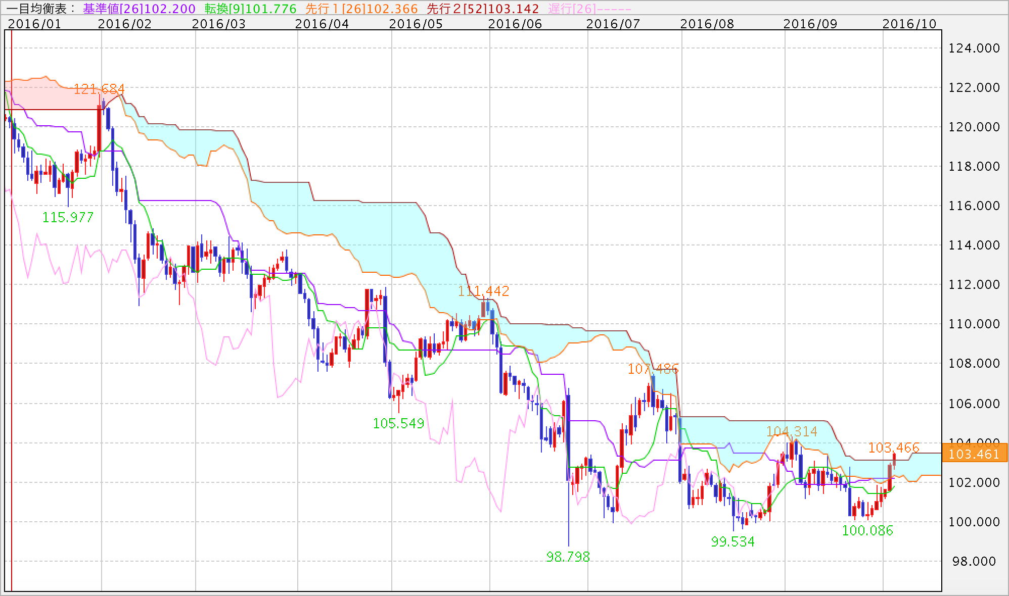 で、今後の展開についてですが、短期的には今日の夕方に書いた記事のとおりです。次のターゲットとしては、当然のことながら先月の高値(9月2日)となった104.30円近辺が意識されています。
