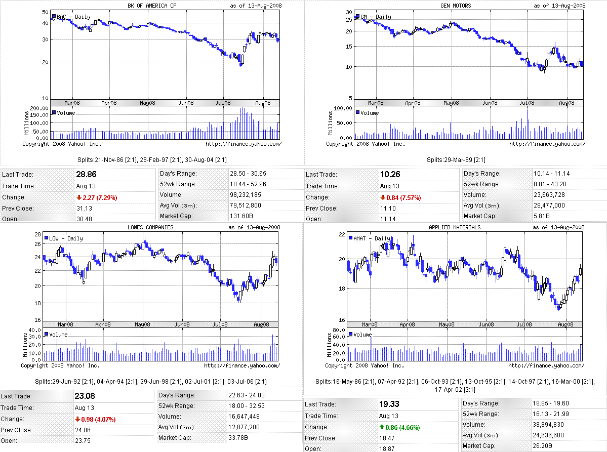 米株は続落。7月小売売上高が予想を下回ったことや原油価格が反発したことから小売関連株が売られました。金融株も引き続き弱かったです。格付けを引き下げられたGMも売られました。