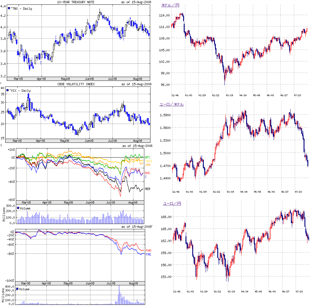 今まで、原油と金融が大きな懸念事項だったわけですが、原油は落ち着いてきました。金融は出てくるニュースを見ると、一喜一憂な感じで底入れにはまだ時間がかかるかなといった印象です。下落が続く金融株も目立ちました。ただ、メリルリンチに続いて、リーマンも保有資産の大量売却に動くようで、身軽にはなってきていますね。身軽になって再スタートするのが、復活への近道でしょう。それと、ソロス氏のファンドがリーマン株を買い増ししたというニュースが意外でした。ソロス氏は、戦後最悪の金融危機と言ってたのですが、底打ちが近いと思ってるのでしょうか。