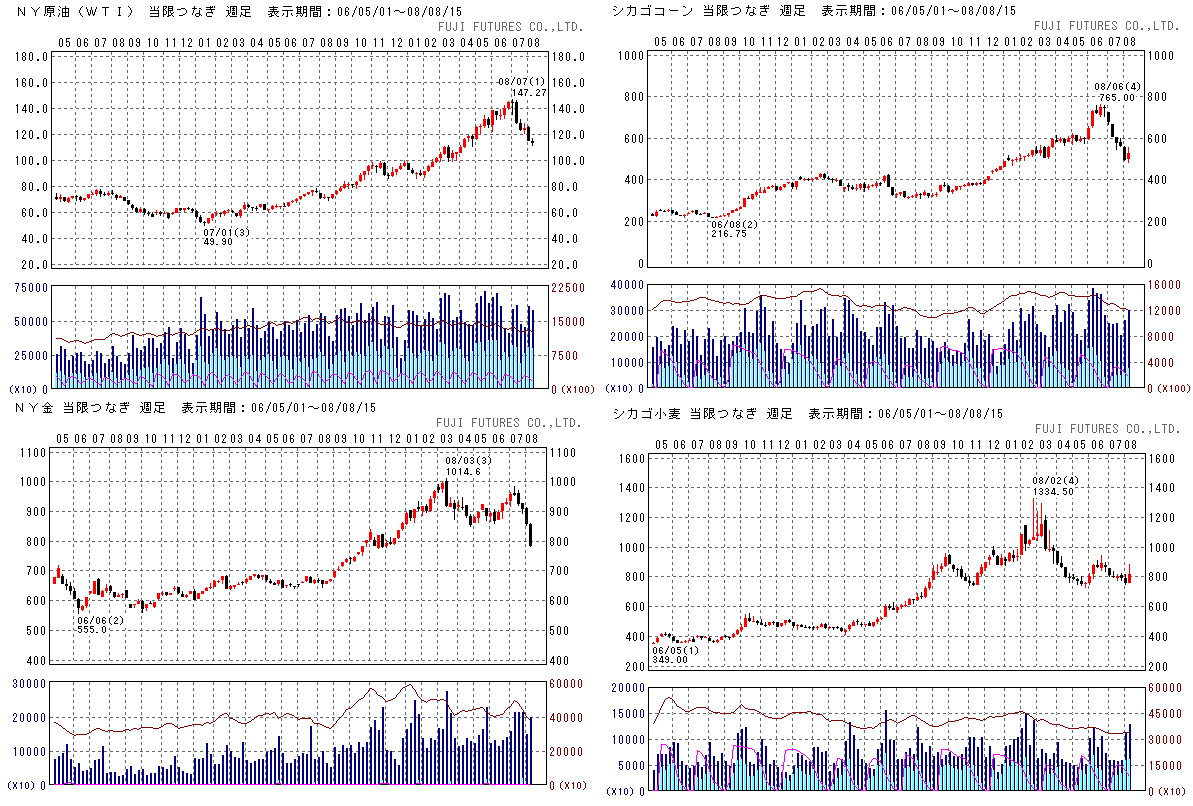 原油は続落。金は、ユーロドルの動きに合わせて大きく下落しました。穀物はなかなか下がりません。