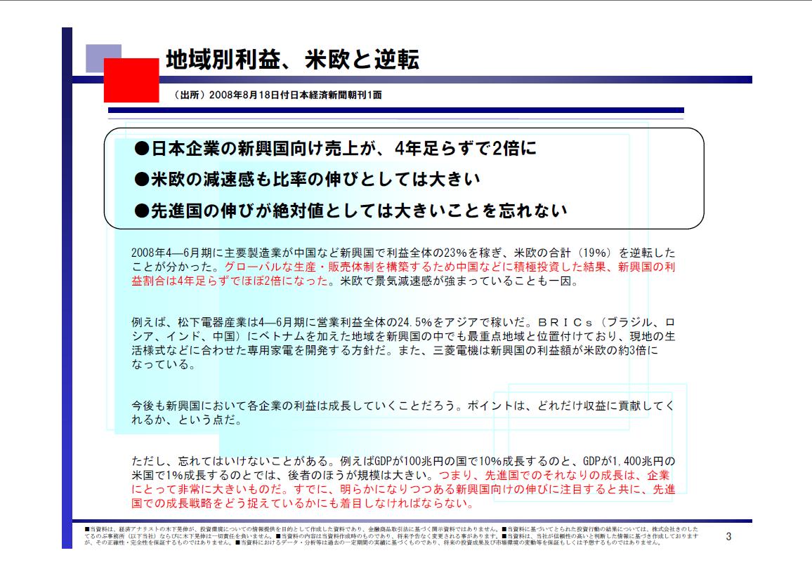 すでに、明らかになりつつある新興国向けの伸びに注目すると共に、