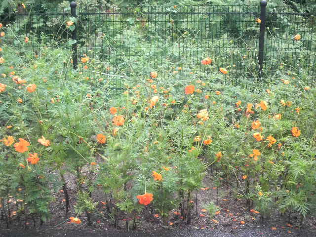 木曽福島から南木曽へはひたすら山の中、雨の恵みに喜んでいるような木々のトンネルを抜けて列車は走る。雨粒が列車の窓を叩きながら、木曽路の旅へ導いてくれている。するすると着いた駅のホームには、オレンジ色の綺麗な花がこちらを向いていた。