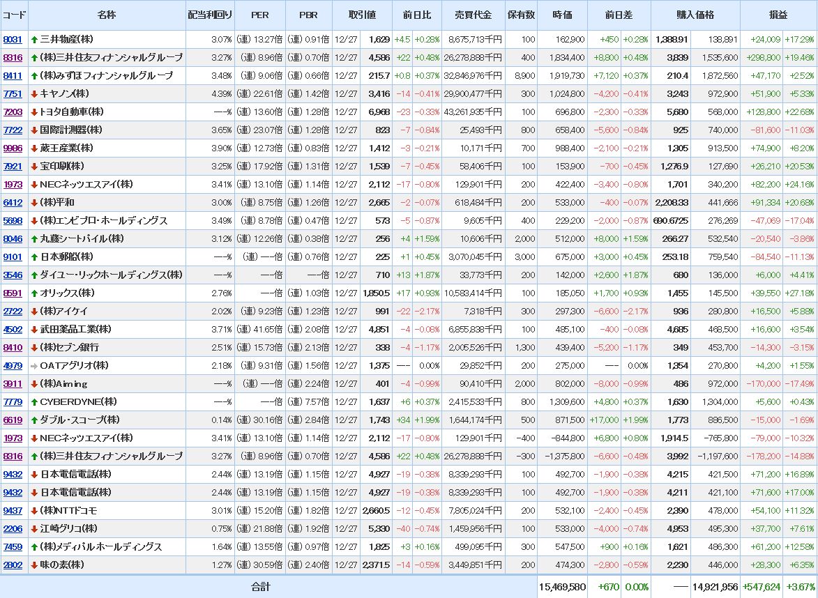 個別の投資で、利益率が15%を超えたら売り時かなとか