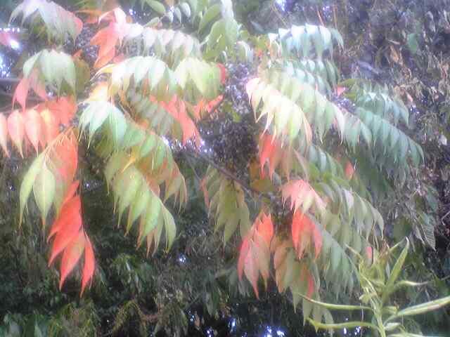 この時期にもう紅葉しています。カラスの大好物の実も生っています。秋を感じる植物です。