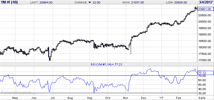 ダウのRSI(14)は、77.21?77.13?