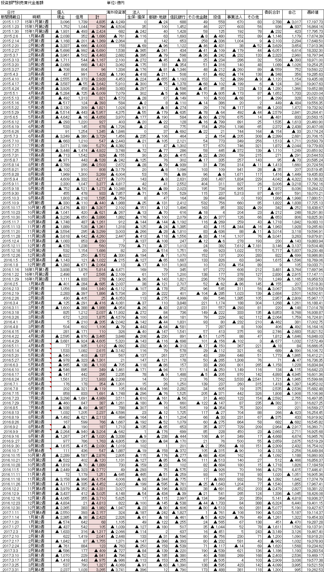 で、3月第4週の投資部門別売買代金差額のグラフです。海外勢はまたも大きく売り越し。