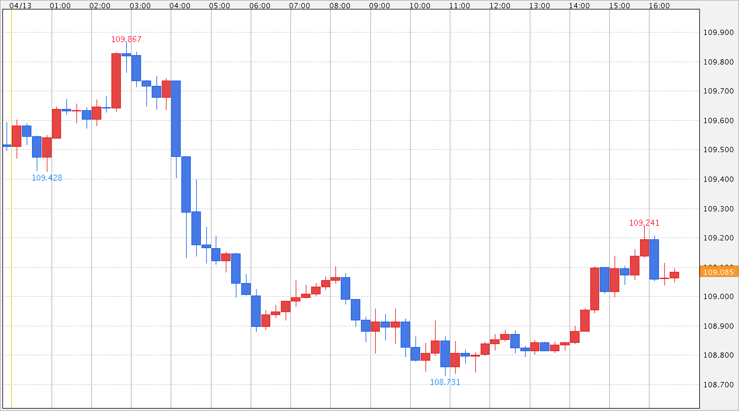 ここまでの値動きについてまとめると、昨日(12日)の東京市場は、1ドル=109.30〜109.70円台で弱めの推移となりました。110円台に戻すのが難しそうで、上値の重い展開からジワリと下方向への動きが続きました。