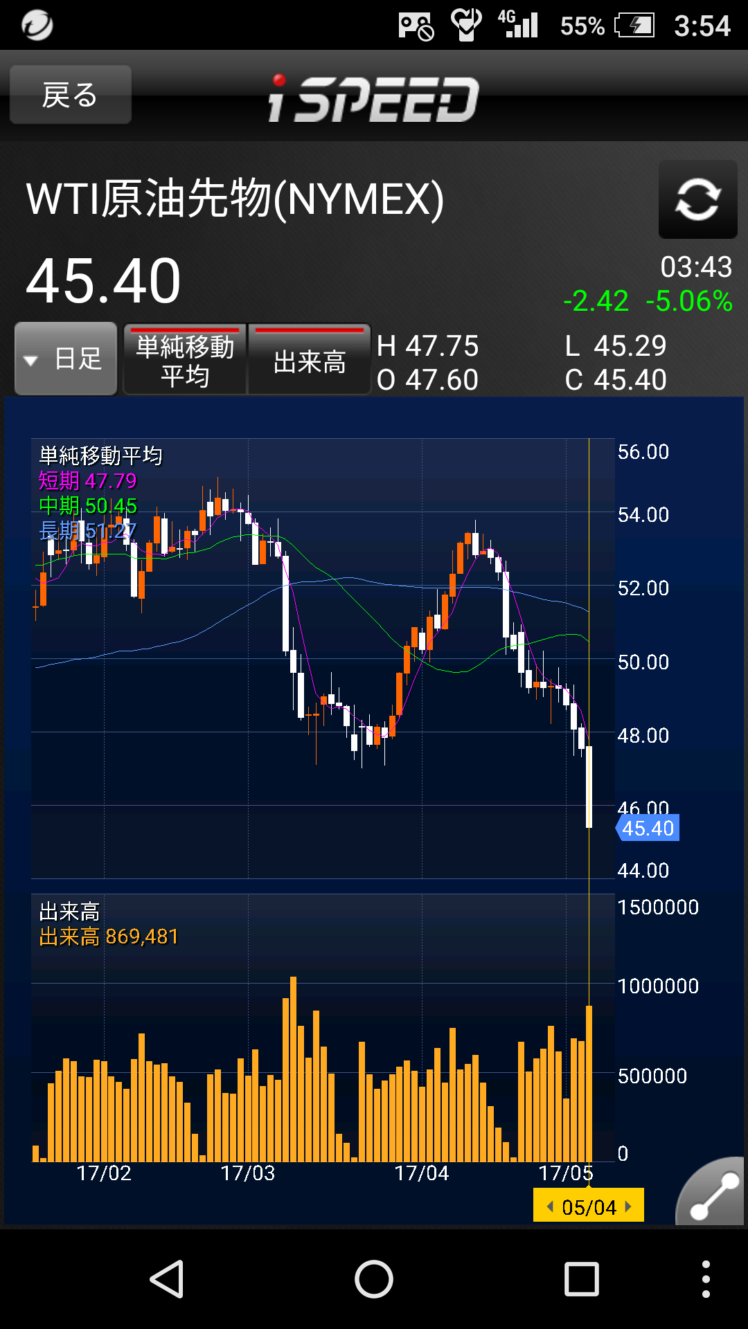 現在原油価格は45付近を推移しています。