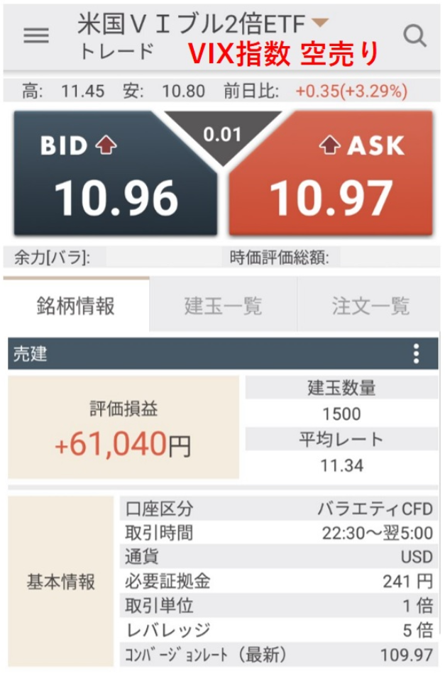 また恐怖指数と呼ばれているVIX指数は大きく上昇しましたので、夜間でも取引ができるCFD口座にて空売りをいれています。