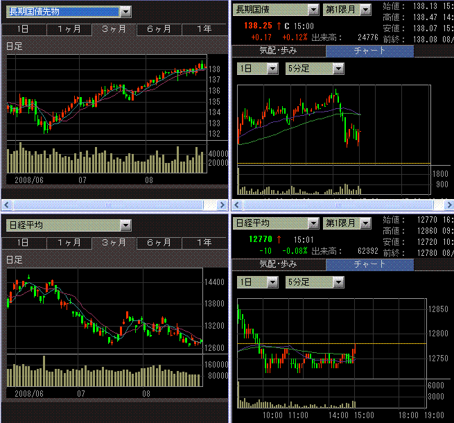 CME日経平均先物は12800円台後半で返ってきたのですが、日本市場が高かったのは寄りだけで、あとは現物も先物も弱く、10時以降は日経平均は昨日と同じ位置で揉み合いとなりました。前夜のアメリカ市場で米国債が買われたことから、CTAによる債券先物買い・株先物売りが入ったとおもわれ、これも株価の押し下げ圧力になったようです。