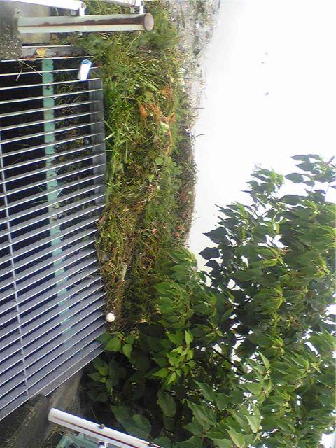 豪雨の後の調整池は満水でした。昨日はここからあふれていたのでしょう。普段30cmくらいで鯉がやっと生きていける池でしたが3m以上増水していました。池中の藻が千切れてきています。こんな中、朝日を求めてチョウが日向ぼっこです。運よく生き残ったのでしょう。ホノボノしてきます