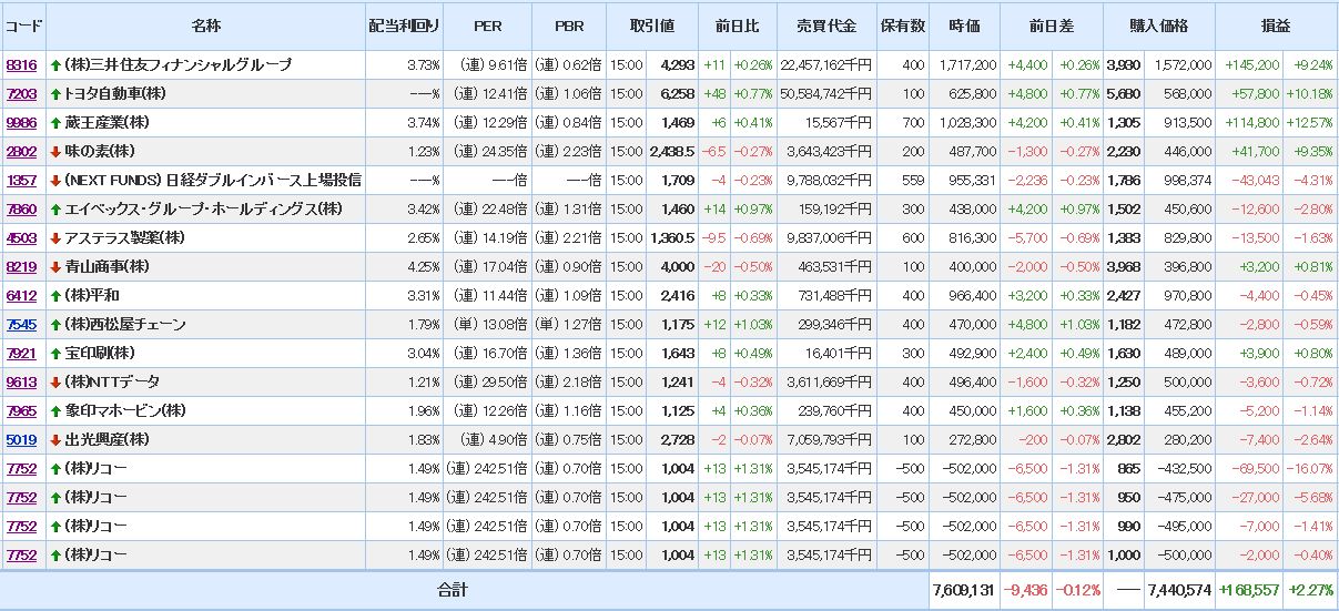 金曜日に、利確を進めた結果、含み益は大幅減。