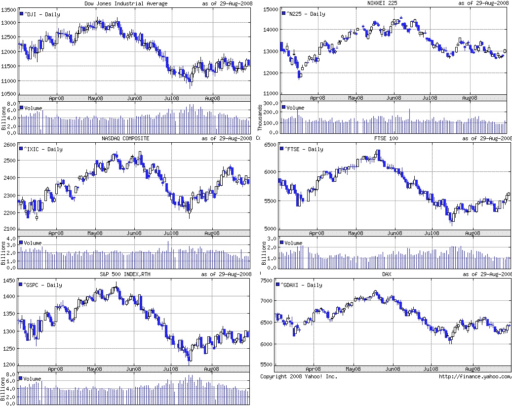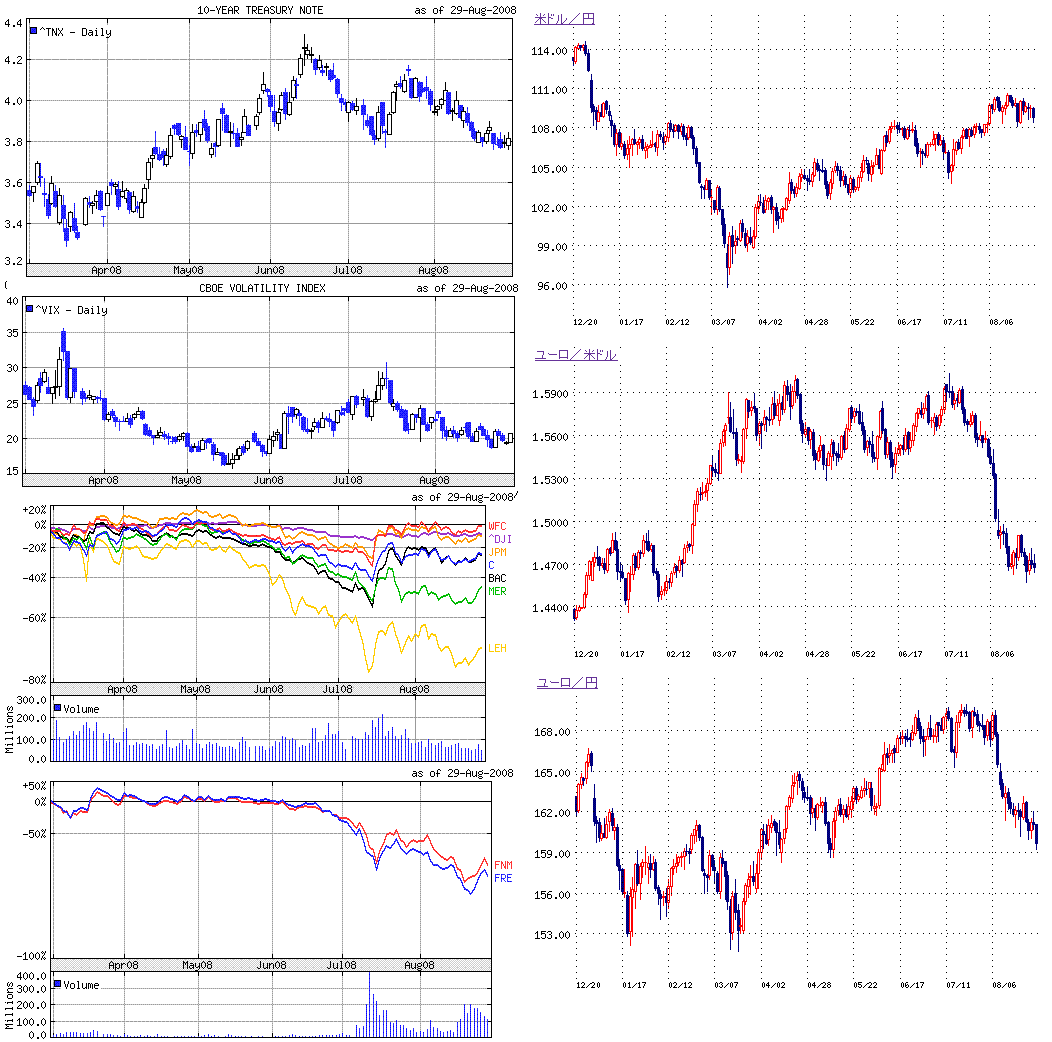 週間では、ダウは-1.00%、ナスダック指数は-3.47%、S&P500は-1.18%でした。今週も薄商いの中、ダウは200ドル上がったり、200ドル下がったりと上下に大きく振れました。今週は、GSEとモノラインの株価が大きく反発しました。週ベースで、フレディマックは+60%、ファニーメイは+37%、MBIAは+59%。これらは、アメリカの金融と住宅市場の膿が集中しているところですね。指数が下落の中、金融株も上昇を見せるものが多かったです。フレディマックとファニーメイは、政府による救済が差し迫っていないとの見方が複数の大手金融機関から出され、これが株価の反発につながりました。ただ、金曜にはワシントンポスト紙が、両社とも資本が不十分との記事を出すなど、見方は分かれているようです。メディアは「もうダメでしょ・・・」という姿勢、証券会社は「まだ大丈夫!」って姿勢に見えます。GS、Citi、メリル、リーマンなどが、揃ってGSEについてのコメント(全般的に楽観)を出してきたのは、何か裏があるのかと思ってしまいますね。