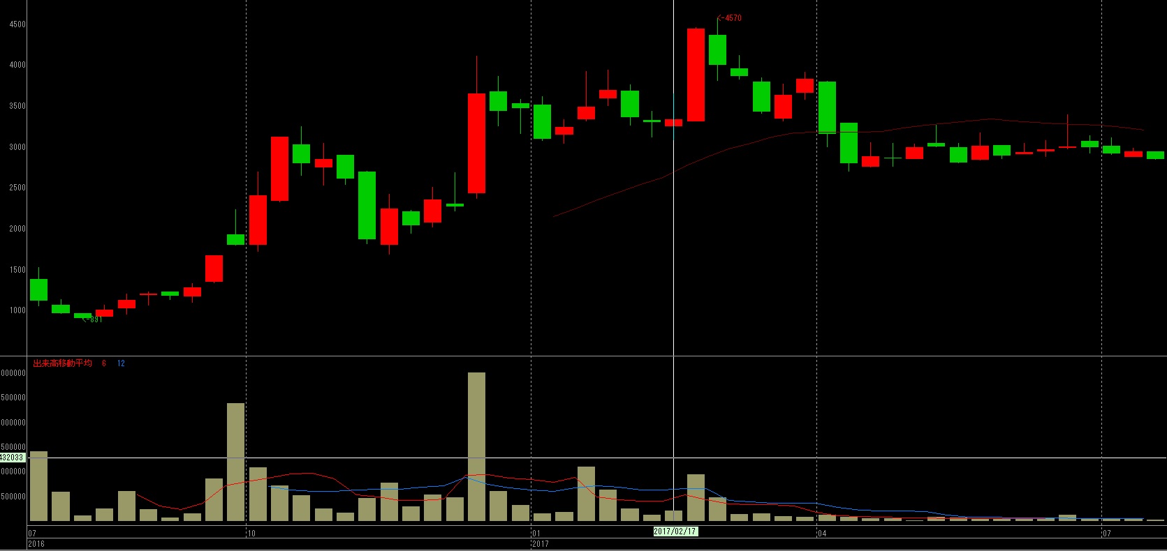 4か月間も出来高が少ないながらも、値上りもせず、値下がりもせずで、安定していた。
