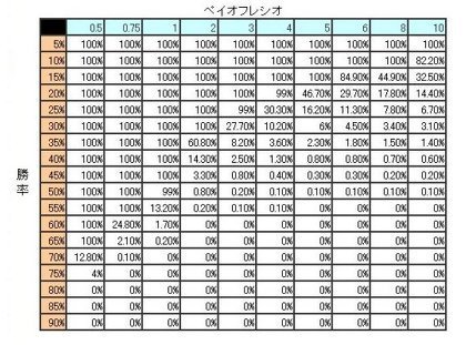 バルサラの破産確率表に基づいて、取れる最大リスク%を決めよう。