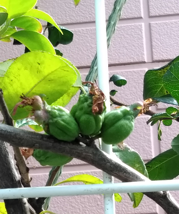 ↑ ボケ(木瓜) 今年はダメかと思っていましたが、台風にも負けずにいたようです 順調にいけばきれいな黄色の実になるはず