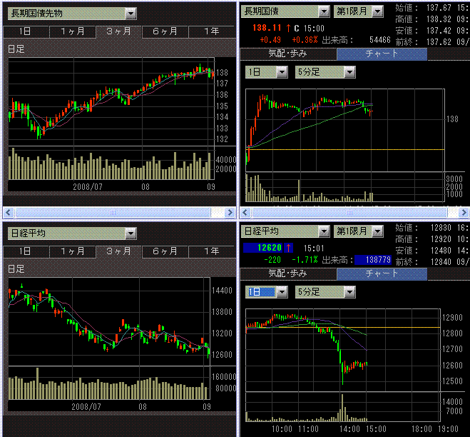 日経平均は大幅続落。前場は12900円付近まで戻す場面もありましたが、後場に先物に大量の売りが出て12500円割れまで急落。その後100円ほどリバウンドして、大引けとなりました。急落した理由はよくわかりません。特にニュースも出てなかったはずですが・・・。福田総理の辞任を嫌気するなら朝から下がっているはずですし。原油も夜間取引で急落していたりと、どこかのヘッジファンドの強制手仕舞いが出ているんですかね。東証一部出来高は18.8億株、売買代金は1.96兆円と後場の急落で商いが膨らみました。