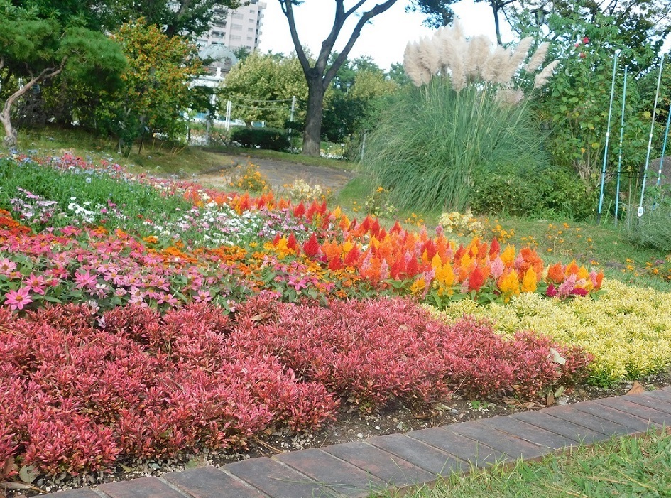 花壇の紅葉、ススキ、その後ろのマンション。