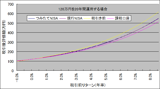 元本120万円を20年運用したとき、以下の4つの口座で運用したときの税引き後リターンを調べ、グラフにしました。