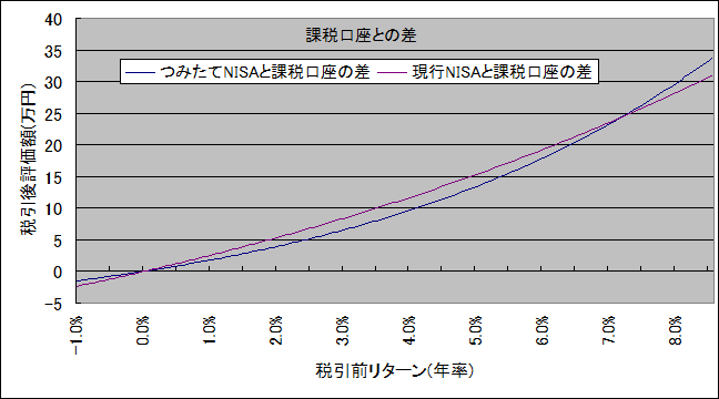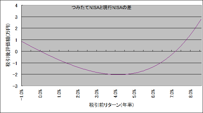 上記は、現行NISAは2年分のNISA枠を使っているが、つみたてNISAは1年分の枠を使っています。その意味で、平等な比較とは言えません。ロールオーバーせずに課税口座で運用するなら、「つみたてNISA」がトクです。