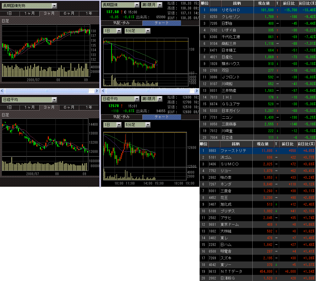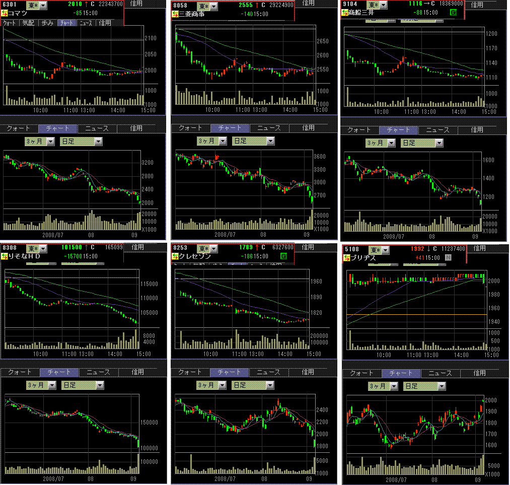 商社、非鉄、鉄鋼、海運、建機といったところは、今日も大きく売られました。それに加えて、今日は金融株にも大きく売られるのがありました。りそな、クレディセゾンは、すごい角度で落ちてます。昨晩の米国市場では、石油や鉄鋼株や金融株はそんなに下がっていなかったので、日本株で急落している銘柄は、ファンド勢の手仕舞いっぽいですね。角度や出来高からすると明日にでも反発しそうですが、どうなることやら。