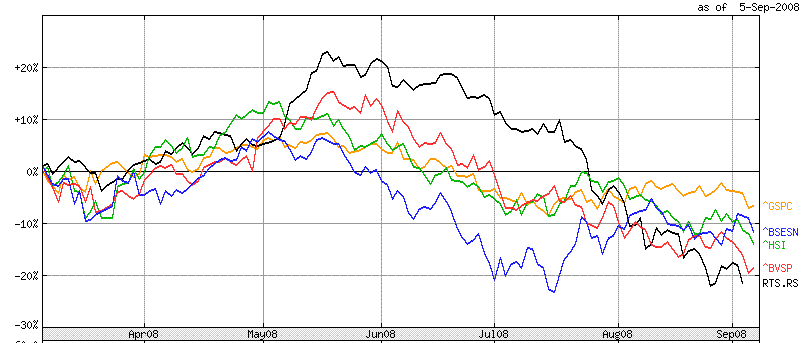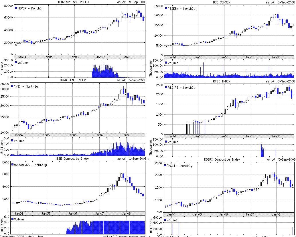 金融収縮が続く間は、新興国、BRICsは厳しそうですね。今は、米国国債がパフォーマンス的に一番良さそうです。ただ、長期で見れば、新興国、BRICsは今が買い時ともいえますので、底打ちを見ながら、ゆるゆると買っていけば、また元に戻ったときに、利益は大きいですね。