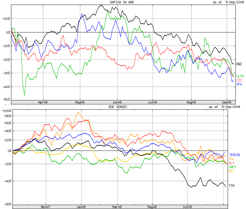 資源価格の下落によりブラジル株が大幅下落。タタモーターズは、ナノの工場建設で揉めているようです。