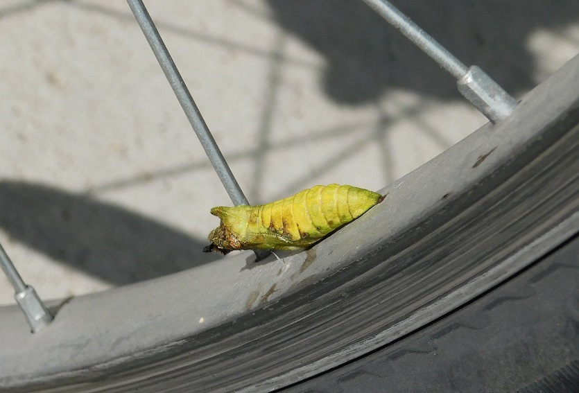 自転車を見たら、さなぎがついていた。