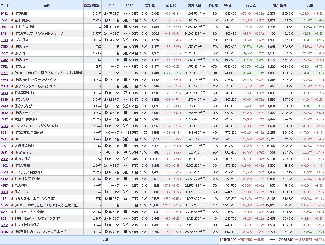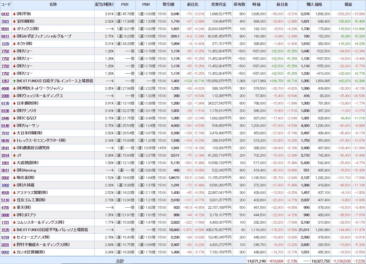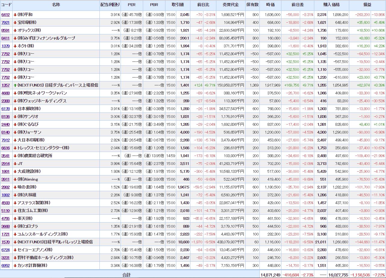 と思っていたところ、連日の暴落でプラ転。今日は、大半を利確しました。