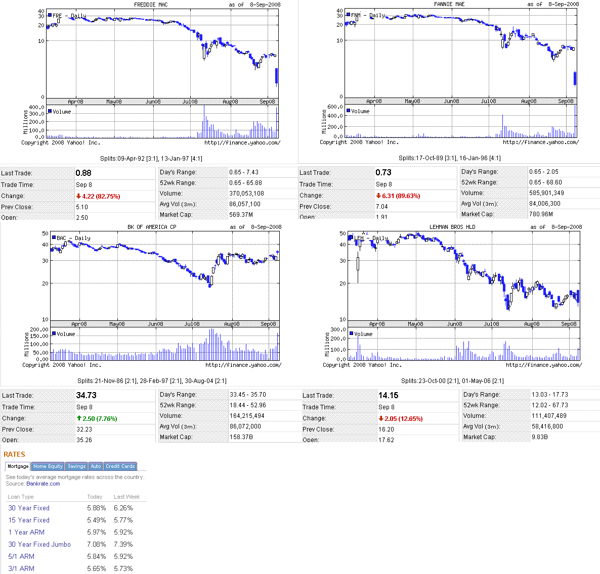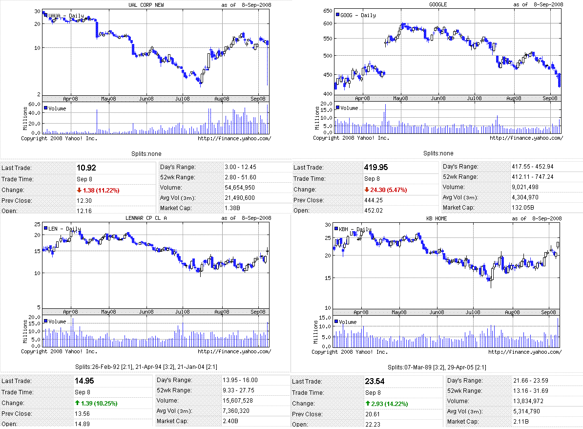 フレディマック、ファニーメイの救済策発表を受け、米株価指数は大幅高。住宅市場・金融市場の安定につながるとの期待から、金融株、住宅建設株の上げ幅が大きかったです(画像2の下の2銘柄が住宅建設業者)。破綻の誤報が流れたUAL株が一時大幅安となりナスダック指数はマイナスへ沈みましたが、引けには戻りました。ハイテク株は全般的にあまり上がりませんでした。グーグルやオラクルなど結構な下げ幅になる銘柄もありました。フレディマック、ファニーメイの株価は大幅な希薄化が予想されることから1ドル以下となりました。