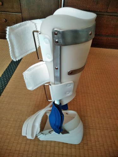 ・装具を作るのに、3月中旬にヒザから下を石膏で型どって、2週間で仕上がり。型どりは石膏を含んだ包帯みたいのを巻いて水にぬらして、5~10分で出来上がりです。そういう包帯なんて初めて知った・・・