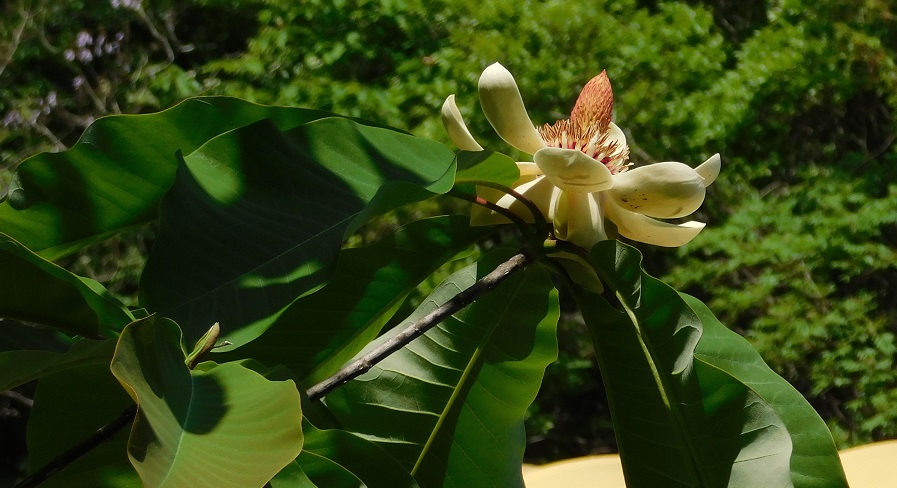ホウバ(朴木)の葉っぱと花がある下で自転車に乗って遊べた。
