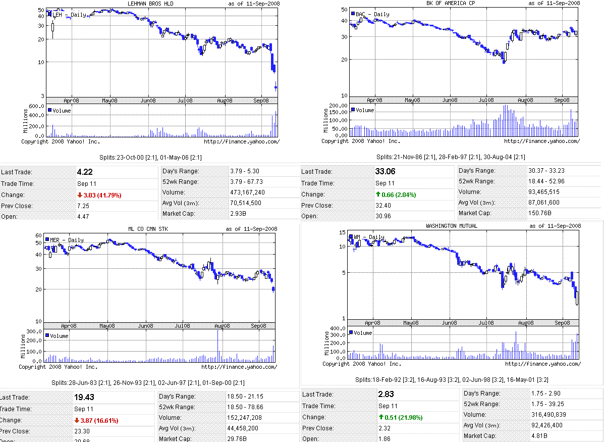 金融不安から米株は大幅安で始まりましたが、株価指数は7月安値に近付いていたこともあり買い戻しが入り前日比でほぼ変わらずまで戻し、引け前にバンカメがリーマン買収に向けて交渉中と報じられ急騰して引けとなりました。原油価格は下落しました。