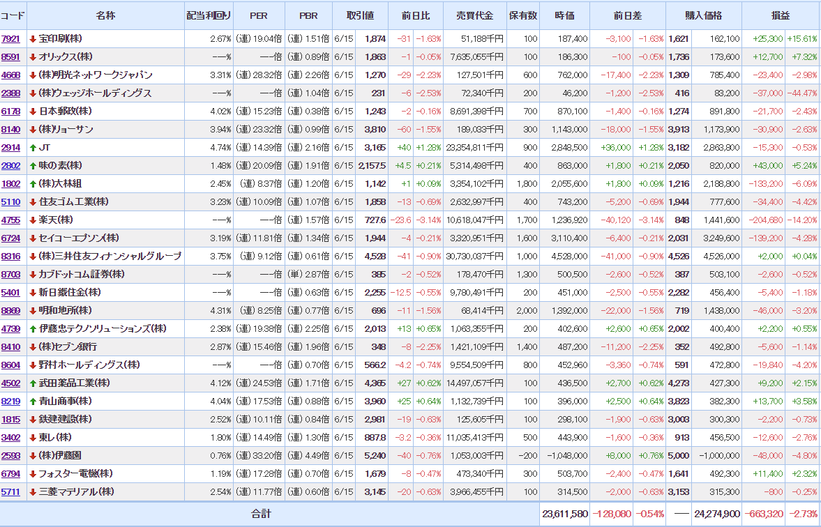 含み損の銘柄数は増えてきた。あまり良くない傾向。