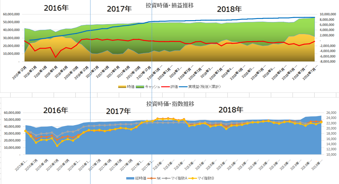 一つは、総投資時価を面グラフ(株投資時価とキャッシュの合計と一致)