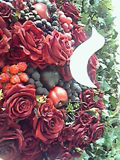 赤い造花と実の入っている飾りで、周囲に白い鳥の飾りがついています。