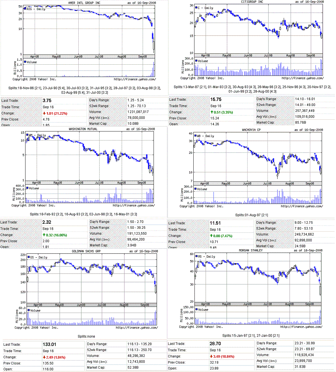 市場の反応は、「リーマンは見捨てて、AIGは救済。じゃあ、線引きはどこなの?」ってなりますよね。政府としては民間でなんとかして欲しかったのでしょうけど、タイムリミットが迫る中どうしようもできず、やむなく救済に乗り出したのだと思います。先週末のリーマンについての会合もそうでしたけど、政府と民間のチキンレースになっています。AIGを潰すとさすがに金融市場がクラッシュするでしょうから、政府がブレーキをかけたのでしょう。