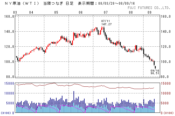 金融不安から米株は大幅続落で始まりましたが、資金繰りに苦しむAIGの救済について政府とFedが協議していると報じられ、救済期待から切り返し大幅高で引けました。また、FOMCでは政策金利は据え置きと決定されました。AIGについては、Fedが850億ドルのつなぎ融資を行うことが、日本時間の10時頃発表されました。