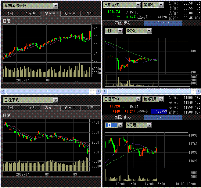 朝方、AIGへのつなぎ融資が行われる可能性との報道により、日経平均は反発して始まりました。午前10時頃に、政府からのAIG救済の発表があり直後は株価は上昇しましたが、CMEの米株価指数先物の反応が鈍かったこともあり、後場に入るとジリジリと下げていきました。メガバンクや自動車株が弱いせいか、TOPIXの動きが弱かったです。米国市場の反応を見てからじゃないと動けないってことなのでしょう。東証一部出来高は22.6億株、売買代金は2.31兆円とそれなりの商いでした。