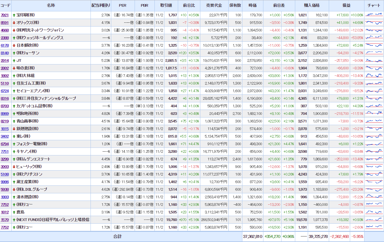 (火曜日に一部利確した銘柄。利確分の半分の株を当時の取得価額と同額で買戻し)