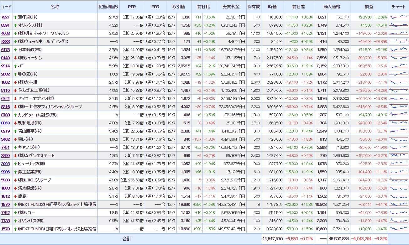 利益の出てる銘柄は利確しているので、含み損状態はしばらく続く。