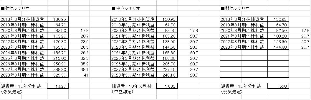 強気:1,927円(1株純資産+10年分の利益、現状の利益増加率が継続前提)