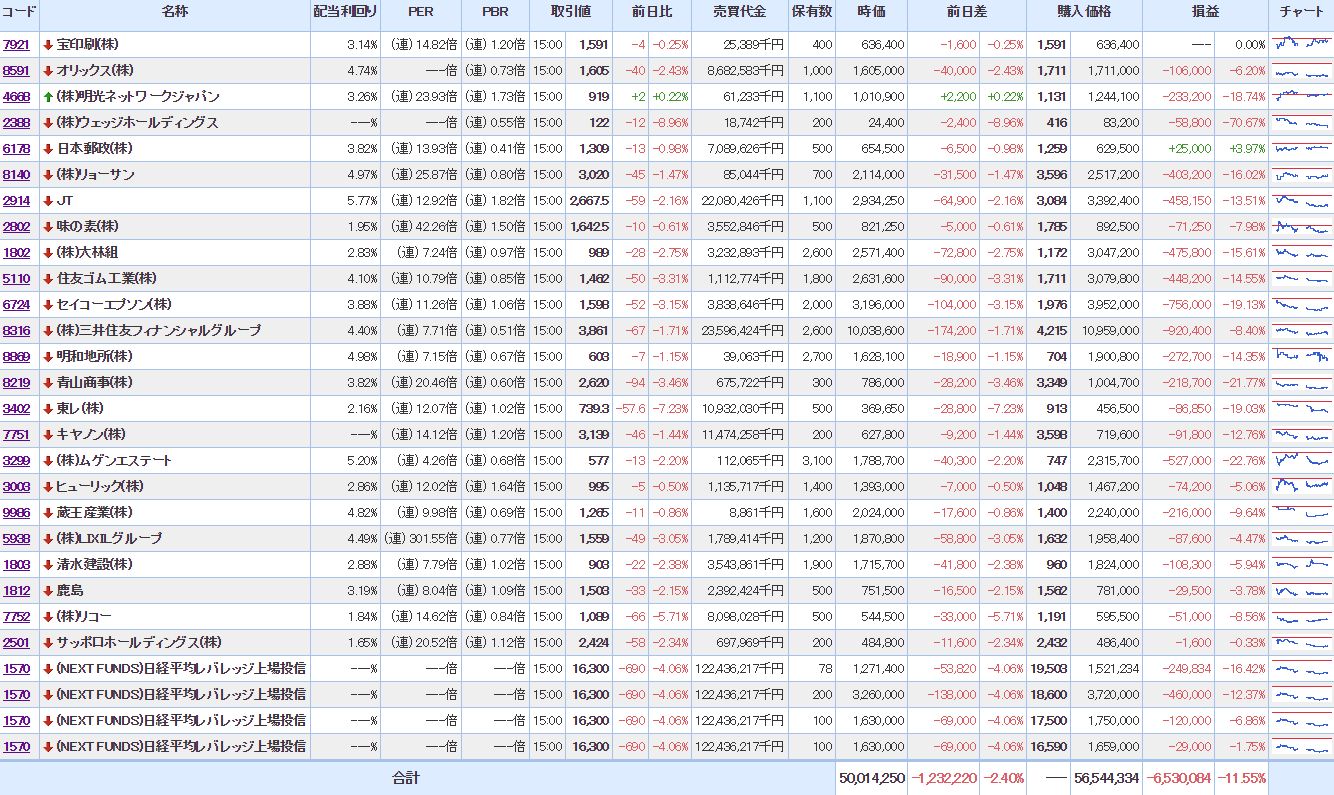 (日経レバ参戦。それ以外の銘柄選定中。PBRが大きく、配当利回りが高く減配しそうな会社とか