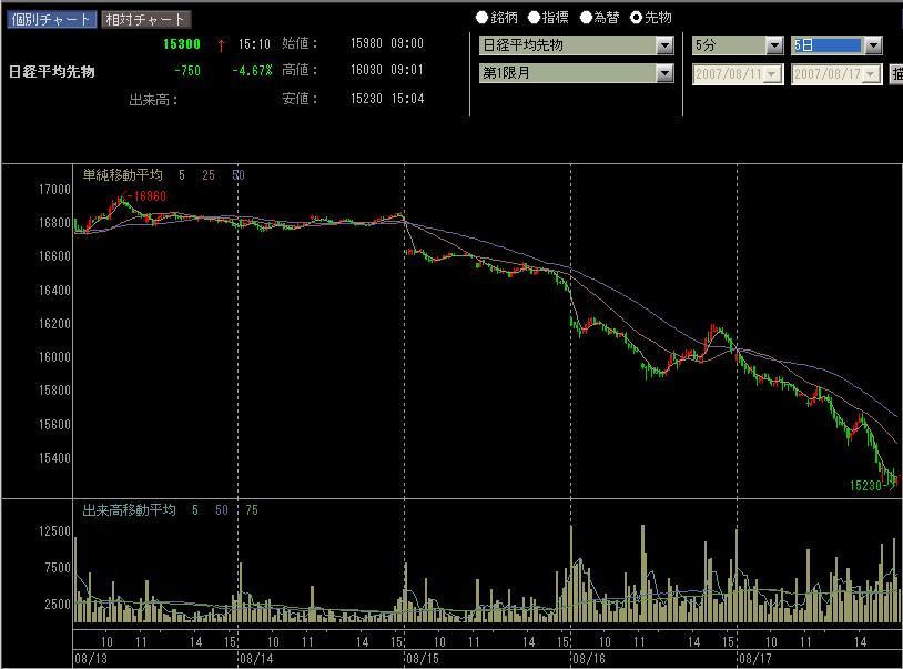・日本が夜の間に為替が一気に円高に。CME NK225はそんなに下げなかったのですが、日本市場が耐えたのは寄りまでで、その後は一方的に売られる展開。後場、いつものようにギャップダウンしてその後はしばらく持ちこたえてましたが、次第に下げはじめ午後2時以降はパニック的な投げ売りの嵐でした。オプションのIVも見たことの無いような水準まで上がっていました。(私のプット売りのポジションもひどいことになりました)